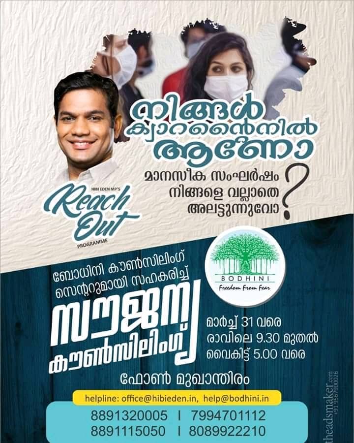 വീടുകളിലെ ഏകാന്തവാസം ഉണ്ടാക്കുന്ന മാനസിക സംഘർഷം കുറയ്ക്കാൻ എം. പി ഹൈബി ഈഡന്റെ നേതൃത്വത്തിൽ സൗജന്യ കൗൺസിലിങ്ങിന് തുടക്കമായി. ബോധിനി കൗൺസിലിംഗ് സെന്ററുമായി സഹകരിച്ച് ഫോൺ കൗൺസിലിംഗ് ആരംഭിച്ചതായി എംപി അറിയിച്ചു. മാർച്ച് 31 വരെയാണ് സേവനം. 88913 20005, 88911 15050, 7994701112, 80899 22210 എന്നീ നമ്പറുകളിലോ help@bodhini.in എന്നീ ഇ-മെയിൽ ഐഡികളിലോ രാവിലെ 9.30മുതൽ വൈകിട്ട് 5 വരെ ബന്ധപ്പെടാം