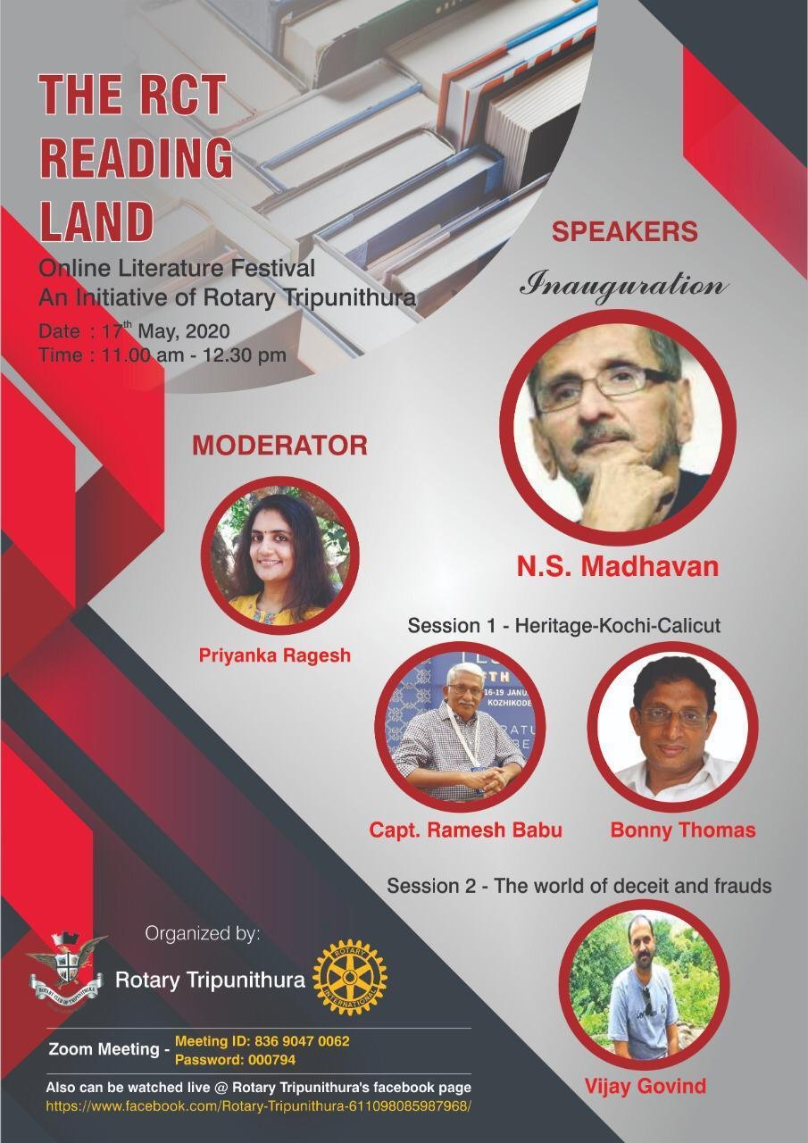 തൃപ്പൂണിത്തറ റോട്ടറി ക്ലബ്ബിന്റ്റെ ആഭിമുഖ്യത്തിൽ ‘റീഡിങ് ലാൻഡു’മായി കൈകോർത്തുകൊണ്ടു ഓൺലൈൻ സാഹിത്യോത്സവം നടത്തുന്നു. നാളെ (17-05-2020) ഞായറാഴ്ച രാവിലെ 11 മുതൽ 12 , 30 വരെയുള്ള ഫെസ്റ്റ് ഉത്ഘാടനം എൻ എസ് മാധവൻ നിർവഹിക്കും. പൈതൃകം, സാമ്പത്തിക രംഗം, എന്നിങ്ങെനെയുള്ള വിഷയങ്ങൾ ആണ് മുഖ്യമായും ചർച്ച ചെയുക. ക്യാപ്റ്റൻ രമേഷ് ബാബു ‘കാലിക്കറ്റ് ഹെറിറ്റേജ് ട്രെയ്ൽസ്’ എന്ന പുസ്തകത്തെ സംബന്ധിച്ചും ബോണി തോമസ് ‘കൊച്ചിക്കാർ’ എന്ന പുസ്തകത്തെയും ആസ്പദമാക്കിയും പ്രഭാഷണങ്ങൾ നടത്തും.
