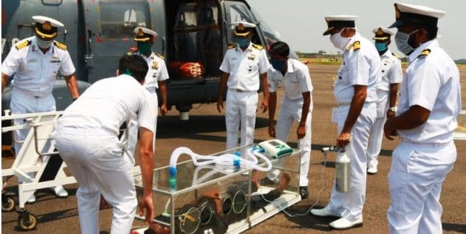 കോറോണ ബാധിതരെ ആശുപത്രിയിലേയ്ക്കോ നിരീക്ഷണസ്ഥലത്തേക്കോ ആകാശമാർഗം എത്തിക്കാനായി എയർ ഇവാക്കുവേഷൻ പോഡ് വികസിപ്പിച്ച് നാവികസേന. കൊച്ചി ദക്ഷിണനാവികസേനാ ആസ്ഥാനത്തെ നേവൽ എയർക്രാഫ്ട് യാർഡിൽ രൂപകല്പന ചെയ്ത് നിർമിച്ച പോഡ് രാജ്യത്തെ വിവിധ നാവികസേനാ കേന്ദ്രങ്ങൾക്കും നൽകും. 50,000 രൂപ ചെലവിൽ നിർമിക്കുന്ന ഇത്തരം പോഡുകൾ വിദേശത്തു നിന്ന് ഇറക്കുമതി ചെയ്യാൻ 60 ലക്ഷം രൂപയോളം ചെലവുവരുമെന്ന് നാവികസേന അറിയിച്ചു. കോവിഡ് ബാധിതരെ ഈ പോഡിൽ കയറ്റി ആകാശ മാർഗം സുരക്ഷിത സ്ഥാനത്ത് എത്തിക്കാനാകും.