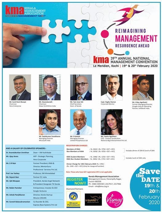 കേരള മാനേജ്മെന്റ്റ് അസോസിയേഷന്റെ വാർഷിക സമ്മേളനം 19,20 തീയതികളിൽ ലെ മെറിഡിയൻ കൺവൻഷൻ സെന്ററിൽ വച്ചു നടക്കും. 19 ന് വൈകിട്ട് 5 മണിക്ക് ഹീറോ ഗ്രൂപ്പ് ചെയര്മാൻ സുനിൽ കാന്ത് മൂൻചാൽ സമ്മേളനം ഉദ്ഘാടനം ചെയ്യും. കോർപ്പറേറ്റ് മെന്റർ ക്യാപ്റ്റൻ രഘുരാമൻ, റീലയൻസ് എന്റർടൈൻമെന്റ് കോൺടെന്റ് സിന്റിക്കേഷൻ സിഇഒ ശ്വേതാ അഗ്നിഹോത്രി, സോഫ്റ്റ് ബാങ്ക് ഇന്ത്യ ഓപ്പറേറ്റിങ് പാർട്ണറും ഗൂഗിൾ ഇന്ത്യ മാനേജിങ് ഡയറക്ടറുമായ വികാസ് അഗ്നിഹോത്രി, മൈക്രോസോഫ്റ്റ് കോര്പറേഷന് ഇന്ത്യ മാനേജിങ് ഡയറക്ടർ ശശികുമാർ ശ്രീധരൻ തുടങ്ങിയവർ കൺവെൻഷനിൽ പങ്കെടുക്കും.