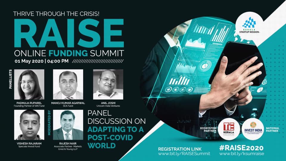 പുതുസംരഭരകരെയും നിക്ഷേപകരെയും കോവിഡ് പ്രതിസന്ധിയിൽ നിന്ന് കരകയറ്റാൻ ഉത്തകുന്ന പരിഹാരമാർഗങ്ങൾ കണ്ടെത്താനും ചർച്ച ചെയ്യാനുമായി കേരള സ്റ്റാർട്ടപ്പ് മിഷനും ടൈ കേരളയും ചേർന്ന് മെയ് 1, 2 ദിവസങ്ങളിൽ ഓൺലൈൻ സമ്മിറ് സംഘടിപ്പിക്കുന്നു. ‘ദി റൈസ്’ എന്ന് നാമകരണം ചെയ്തിരിക്കുന്ന ഈ സമ്മിറ്റിൽ സാമ്പത്തിക രംഗത്തെ പ്രമുഖർ, വെഞ്ചർ ക്യാപിറ്റലിസ്റ്സ്, ഏയ്ഞ്ചൽ ഇൻവെസ്റ്റർസ്, എന്നിവർ പങ്കെടുക്കുന്നു. കൂടുതൽ വിവരങ്ങൾക് സന്ദർശിക്കൂ: https://seedingkerala.com/raise.html.