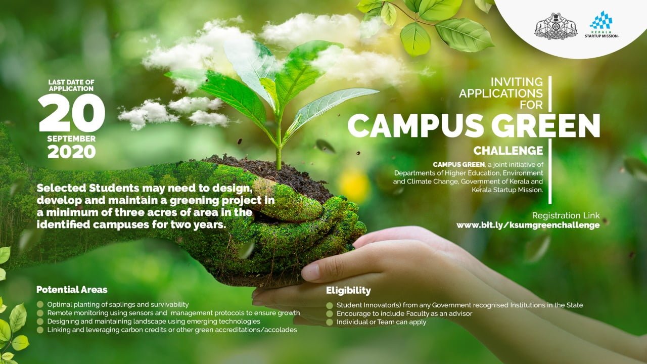 ഓൺ-കാമ്പസ് ആപ്ലിക്കേഷനുകളുമായി ബന്ധപ്പെട്ട സുസ്ഥിര വെല്ലുവിളികളെ അഭിമുഖീകരിക്കുന്നതിന് സാങ്കേതികവിദ്യയെ പ്രയോജനപ്പെടുത്തിക്കൊണ്ട് ‘ക്യാമ്പസ് ഹരിതവൽക്കരണം’ സംരംഭത്തെ പിന്തുണയ്ക്കുന്നതിനായി നൂതന പരിഹാരങ്ങളെയും നൂതന പ്രോജക്ടുകളെയും പിന്തുണയ്ക്കുന്നതിനായി വിദ്യാർത്ഥികൾക്കും സ്റ്റാർട്ടപ്പുകൾക്കും ധനസഹായം നൽകാൻ ക്യാമ്പസ് ഗ്രീൻ പദ്ധതി ഉദ്ദേശിക്കുന്നു. അപേക്ഷിക്കാനും കൂടുതൽ വിശദാംശങ്ങൾക്കും, ദയവായി സന്ദർശിക്കുക- https://campusgreen.startupmission.in. അവസാന തീയതി സെപ്റ്റംബർ 20. ജൈവവൈവിധ്യ പരിപാടികളിൽ സാങ്കേതികവിദ്യയുടെ ഉപയോഗം ‘ഗ്രീൻ ചലഞ്ച്’ വർദ്ധിപ്പിക്കുന്നു.
