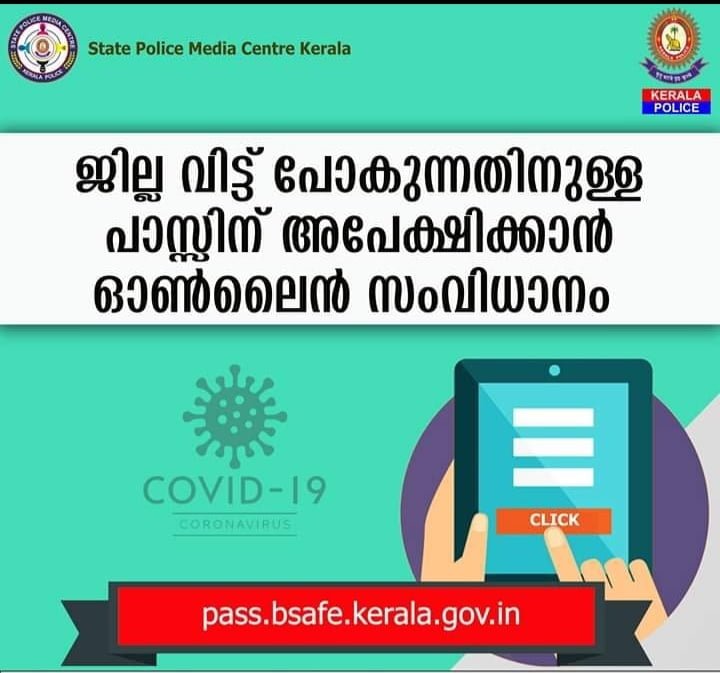 മറ്റു ജില്ലകളിലേക്ക് യാത്ര ചെയ്യുന്നവർക്ക് പാസ്സിനായി ഇനി പോലീസ് സ്റ്റേഷൻ കയറിയിറങ്ങേണ്ട. പാസ്സ് ലഭ്യമാക്കാൻ ഓൺലൈൻ സംവിധാനമുണ്ട്.