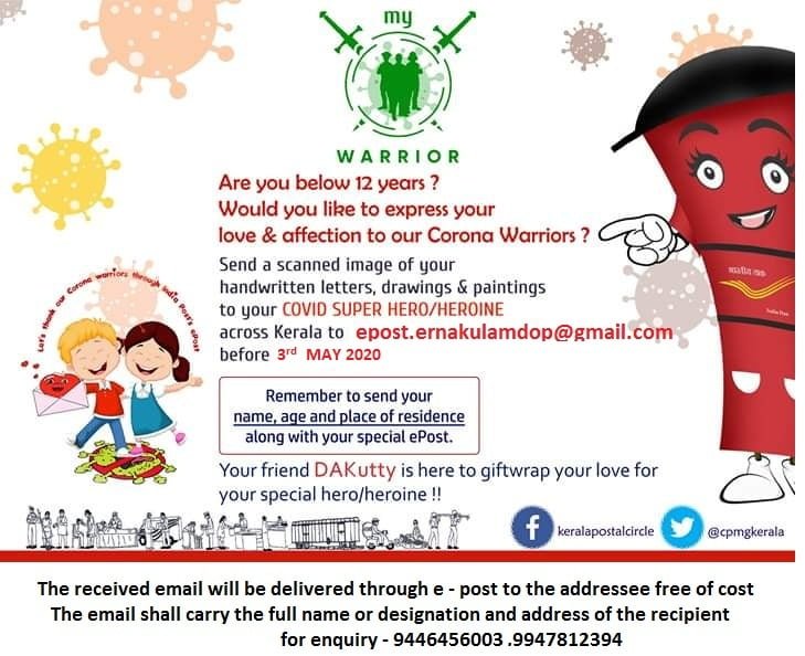 നിങ്ങളുടെ കൈപ്പടയിലെഴുതിയ കത്തുകളും നിങ്ങൾ വരച്ച ചിത്രങ്ങളും പെയിന്റിങ്ങുകളും സ്കാൻ ചെയ്ത് 3 മേയ് 2020 നു മുൻപായി epost.ernakulamdop@gmail.com എന്ന ഇമെയിൽ വിലാസത്തിലേയ്ക്ക് അയയ്ക്കുക.