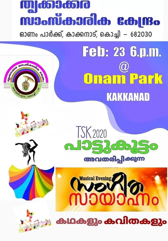 The concert is conducted under the auspices of the Thrikkakara Cultural Center of Kakkanad. The musical evening by TSK songs will be held at Kakkanad Onam Park on the 23rd at 6 pm. Children will enjoy a musical evening including stories and songs.