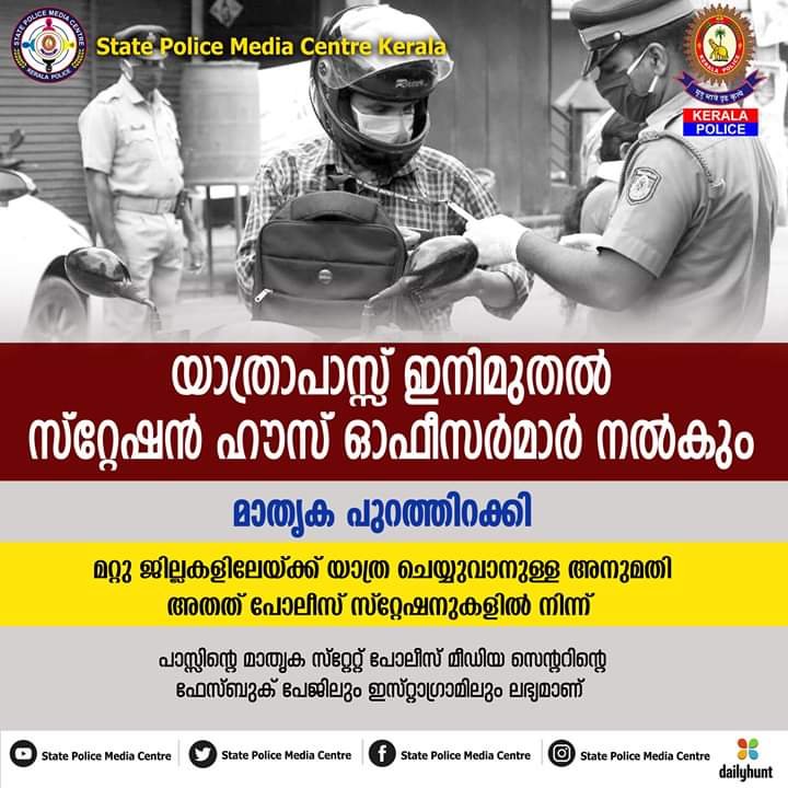 കോവിഡ് 19 ന്റെ പശ്ചാത്തലത്തിൽ കേരളത്തിൽ സർക്കാർ അനുവദിച്ച ലോക്ക്ഡൗൺ ഇളവുകളുടെ ഭാഗമായി മറ്റു ജില്ലകളിലേക്ക് യാത്ര ചെയ്യുന്നവർക്ക് പോലീസ് സ്റ്റേഷനിൽ നിന്ന് പാസ് ലഭ്യമാക്കും. അടുത്ത ജില്ലകളിലേക്ക് അത്യാവശ്യ യാത്രകൾ ചെയ്യേണ്ടവർ ഇനി അതാത് പോലീസ് സ്റ്റേഷനിലെ സ്റ്റേഷൻ ഓഫീസർമാരെ സമീപിച്ചാൽ മതി.
