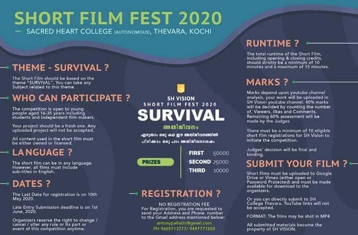 ലോക്ക്ഡൗൺ കാലത്ത് കഥയെഴുതി ഹൃസ്വ സിനിമ എടുക്കാൻ അവസരം. തേവര സേക്രട്ട് ഹാർട്ട് കോളേജിന്റെ ഡിജിറ്റൽ പ്ലാറ്റഫോമായ എസ്എച്ച് വിഷനാണ് ‘അതിജീവനം’ വിഷയമാക്കി ഷോർട് ഫിലിം മത്സരം സംഘടിപ്പിക്കുന്നത്. ‘എഴുതാം ഒരു കഥ ഈ അതിജീവനത്തിൽ, പിടിക്കാം ഒരു പടം അതിജീവനത്തിനു ശേഷം ‘ എന്ന ടാഗ്ലൈനുള്ള ഈ മത്സരത്തിൽ 16 നും 35 നും മദ്ധ്യേ പ്രായമുള്ള ആർക്കും പങ്കെടുക്കാം. മെയ് 10 മുൻപ് രജിസ്റ്റർ ചെയ്യണം.