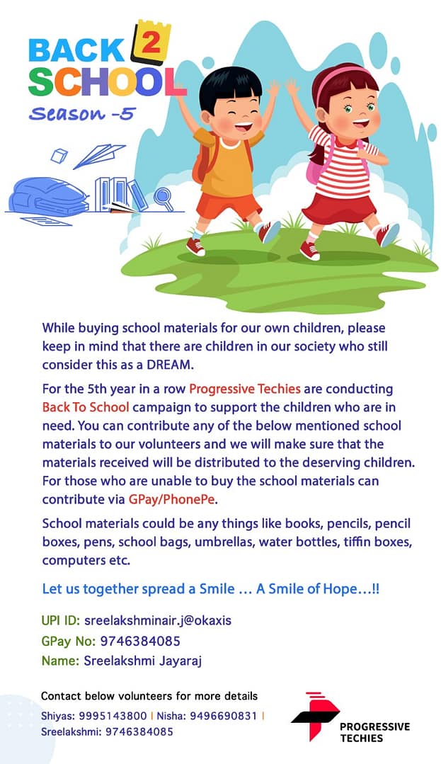 കൊച്ചി ഇൻഫോപാർക് കേന്ദ്രമാക്കി പ്രവർത്തിക്കുന്ന പ്രോഗ്രസ്സിവ് ടെക്കിസ് കൂട്ടായ്മ സ്കൂൾ കുട്ടികൾക്കായി വിവിധ സഹായ പദ്ധതികൾ നടപ്പിലാക്കുന്നു. സ്വന്തം കുട്ടികൾക്കായി പഠനോപകരണങ്ങൾ വാങ്ങുമ്പോൾ, സമൂഹത്തിൽ ഇവയൊക്കെ ഒരു സ്വപനം മാത്രമായി കരുതുന്ന കുരുന്നുകൾക്ക് കൂടി പഠനോപരണങ്ങൾ എത്തിക്കുന്നതിനാണ് ഇവർ മുഖ്യ പരിഗണന നൽകുന്നത്. തുടർച്ചയായ അഞ്ചാം വർഷമാണ് ഈ കൂട്ടായ്മ ഇത്തരം സാമൂഹ്യ സേവന പദ്ധതി വിജയകരമായി അവതരിപ്പിക്കുന്നത്.