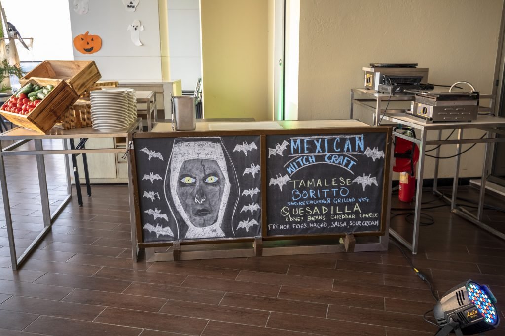ഭക്ഷണ വിഭവങ്ങളുടെ പേരുകളും രസകരമായിരുന്നു; ‘രക്തരക്ഷസിന്റ്റെ തലച്ചോർ സ്റ്റാർട്ടർ’, ‘ബ്ലഡ് സക്കർ സൂപ്പ്’, കള്ളിയങ്ങോട്ട് നീലി മോക്ക് ടെയിൽ’, ശവപ്പെട്ടി ആകൃതിയിലുള്ള പേസ്റ്ററികളും ഡെസേർട്ടുകളും, ചിലന്തിവല ആകൃതിയിൽ തയാറാക്കിയ കേക്ക്, എന്നിങ്ങനെയാണ് വിഭവങ്ങൾ അണിനിരത്തിയിരുന്നത്. കഴിഞ്ഞില്ല, ‘ഇറ്റാലിയൻ ഡെത്ത് വിഷ്, മച്ചു-പിച്ചു സീഫുഡ്, സ്പൂകി സ്ലൈഡേഴ്സ്, മെക്സിക്കൻ വിച്ക്രാഫ്റ്റ് ഡിലൈറ്റ്സ് എന്നിങ്ങനെ രുചികരമായ ഒട്ടേറെ വിഭവങ്ങളും പുതുമയാർന്ന ഈ ഡിന്നറിന്റ്റെ ഭാഗമായിരുന്നു. ലൈറ്റുകൾ ഡിം ചെയ്ത് മെഴുകുതിരി വെളിച്ചത്തിലാണ് റെസ്റ്റോറന്ററുകളുടെ അകം ക്രമീകരിച്ചിരുന്നത്. ഭക്ഷണം വിളമ്പാനും സഹായിക്കാനുമായി പിശാചുകളുടെയും പ്രേതങ്ങളുടെയും വേഷങ്ങൾ ധരിച്ച കുറെ പേർ അതിഥികൾക്കിടയിൽ ചുറ്റി കറങ്ങുന്നുണ്ടായിരുന്നു.