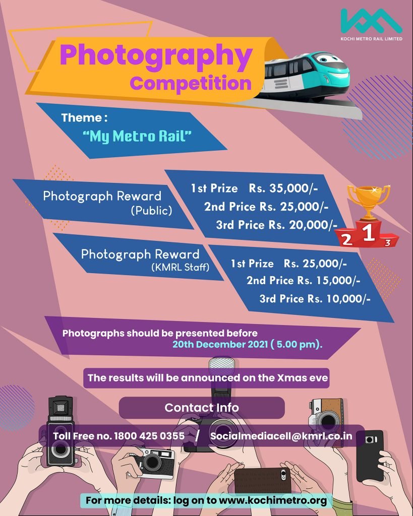 KMRL is organizing a Photography competition for the people of Kochi and surrounding areas on the theme called “My Metro Rail”. The photographs should be of maximum 10 MB Size either in Black and White or in Colour. The participants may upload their photographs to the below link :