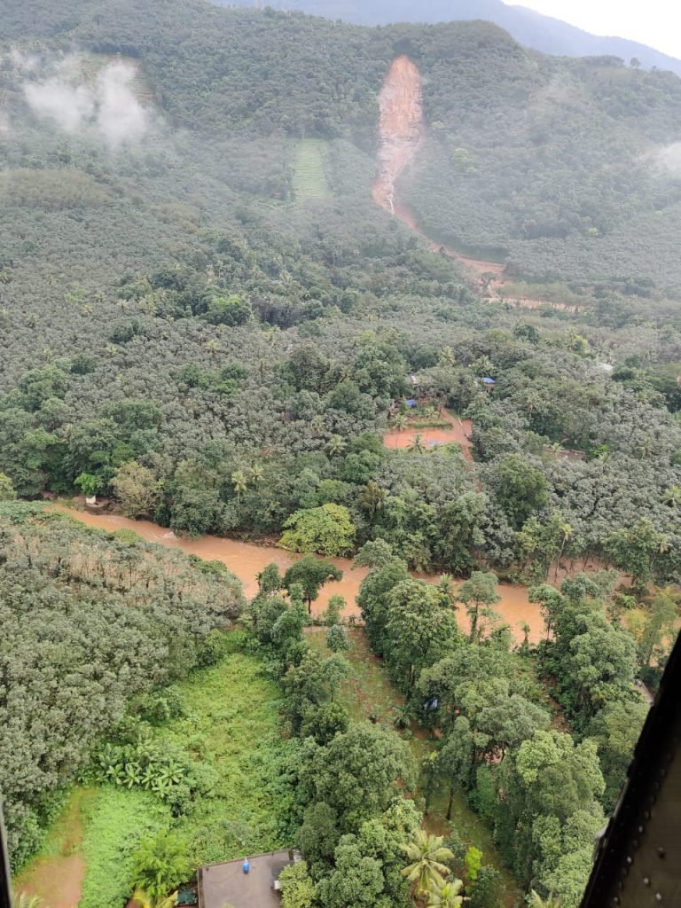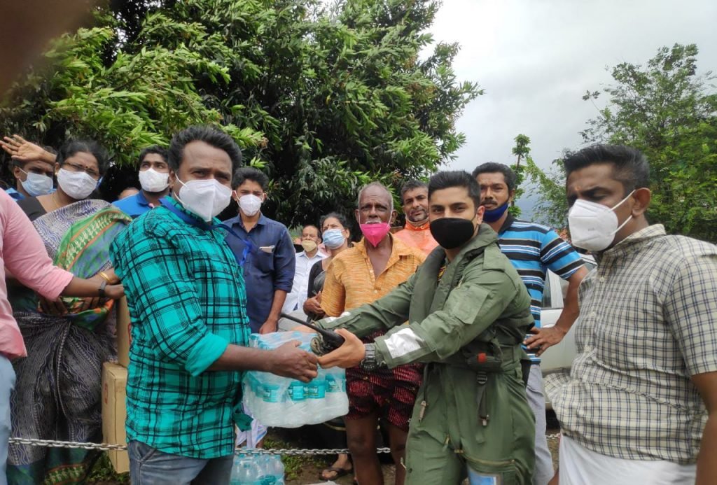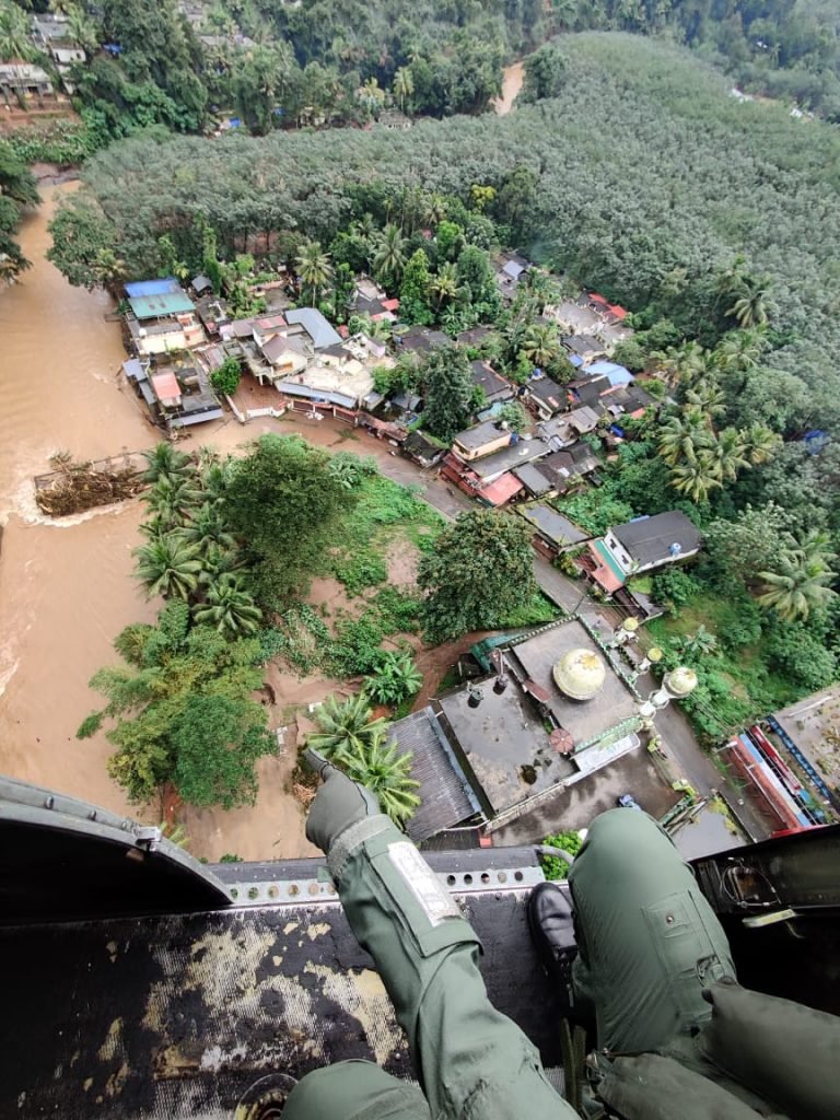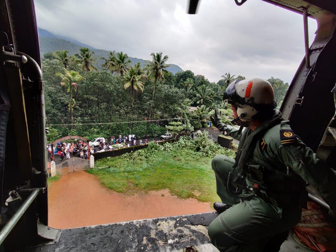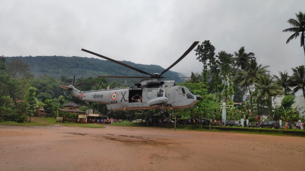 In light of the heavy rainfall in various parts of Kerala under the influence of a low pressure area in the Arabian Sea, multiple landslides had occurred at Kootickal in Kottayam district and Kokkayaar in Idukki district. Based on a request from the Kerala State Disaster Management Authority (KSDMA), a helicopter from Naval Air Station, INS Garuda was launched at 0900 h to the location for dropping relief materials prepared by KSDMA. In addition, Indian Navy also ferried relief materials including water bottles from the Southern Naval Comamnd resources to the nearest helipad at JJMM HS School-Yendayar. The helicopter undertook aerial sorties to assess the status of the floods and landslides for authorities to plan any land based search and rescue operations. At present all Air assets, Rescue teams, and Team of Naval divers