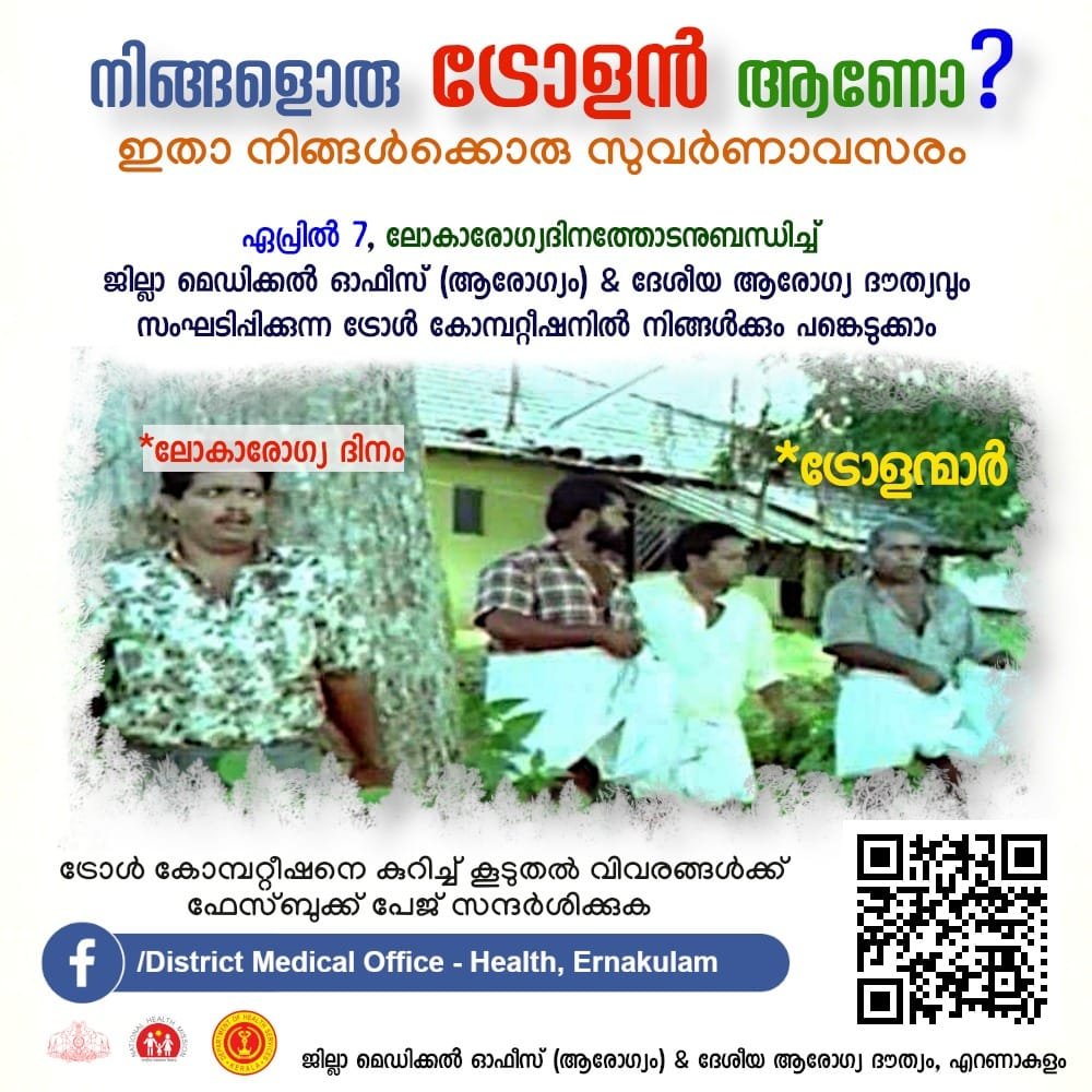 പൊതുജനങ്ങൾക്ക് ഉപകാരപ്രദമായ ആരോഗ്യസംബന്ധമായ ട്രോളുകൾ നിങ്ങൾക്കുണ്ടാക്കാൻ സാധിക്കുമെങ്കിൽ നിങ്ങൾക്കിതാ ഒരു സുവർണ്ണാവസരം ! ലോകാരോഗ്യദിനത്തോടനുബന്ധിച്ച് ജില്ലാ മെഡിക്കൽ ഓഫീസ് (ആരോഗ്യം) & ദേശീയ ആരോഗ്യവും ദൗത്യം, എറണാകുളവും ചേർന്ന് സംഘടിപ്പിക്കുന്ന ട്രോൾ കോമ്പറ്റീഷനിൽ നിങ്ങൾക്കും പങ്കെടുക്കാം. താഴെ കൊടുത്തിരിക്കുന്ന വിഷയങ്ങളിൽ ട്രോൾ ഉണ്ടാക്കാവുന്നതാണ്. 2021 ഏപ്രിൽ 7 മുതൽ 30 വരെയാണ് തയ്യാറാക്കുന്ന ട്രോളുകൾ പോസ്റ്റ് ചെയ്യുന്നതിനുള്ള സമയം. നിശ്ചിത സമയത്തിനുള്ളിൽ തന്നെ ട്രോളുകൾ പോസ്റ്റ് ചെയ്യേണ്ടതാണ്. മത്സരത്തിൻ്റെ വിജയികളെ മെയ് 16 ന് പ്രഖ്യാപിക്കുന്നതാണ്.മറ്റ് ജില്ലകളിൽ നിന്നുള്ളവർക്കും മത്സരത്തിൽ പങ്കെടുക്കാവുന്നതാണ്.