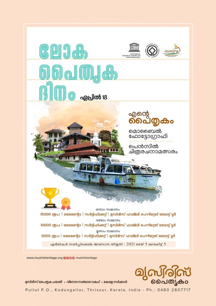 മുസിരിസ് പൈതൃക പദ്ധതി പൊതു വിദ്യാഭ്യാസ വകുപ്പിന്റെ സഹകരണത്തോടെ ലോക പൈതൃക ദിനത്തോടനുബന്ധിച്ച് ‘എൻ്റെ പൈതൃകം’ എന്ന പേരിൽ ഹൈ സ്കൂൾ വിദ്യാർത്ഥികൾക്കായി മൊബൈൽ ഫോട്ടോഗ്രാഫി , പെൻസിൽ ചിത്രരചനാ മത്സരം നടത്തുന്നു.
