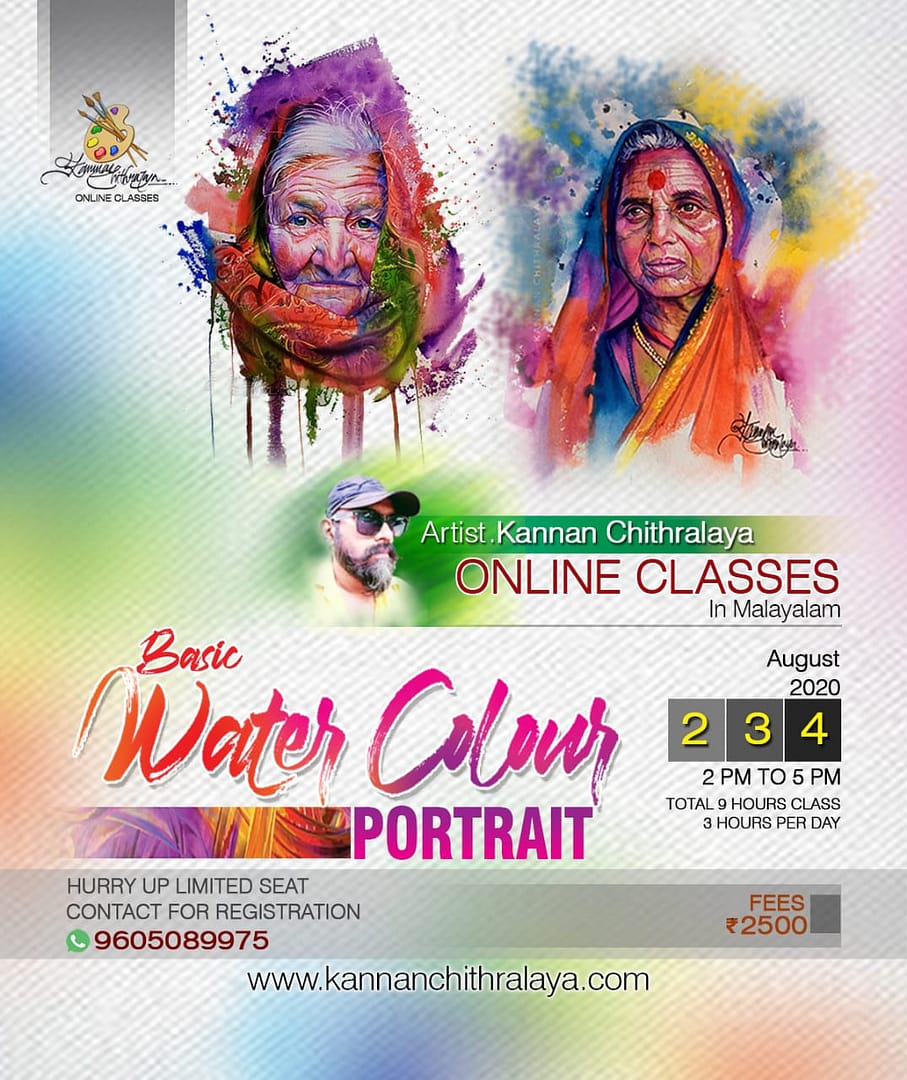 വാട്ടർ കളർ പോട്രൈറ് മേക്കിങ്ങിൽ കൂടുതൽ പരിശീലനം നേടാൻ ആഗ്രഹിക്കുന്നവർക്കായി പ്രശസ്ത ആർട്ടിസ്റ്റ് കണ്ണൻ ചിത്രാലയ സംഘടിപ്പിക്കുന്ന ത്രിദിന ഓൺലൈൻ ക്ലാസുകൾ ഓഗസ്റ്റ് മാസം 2നു ആരംഭിച്ച് 4 ന് അവസാനിക്കും. എല്ലാ ദിവസവും ഉച്ചകഴിഞ്ഞു 2 മുതൽ 5 മണി വരെയായിരിക്കും ക്ലാസ് സമയം. ഇതിൽ പങ്കെടുക്കാൻ താപര്യമുള്ളവർ മുൻകൂട്ടി പേര് രജിസ്റ്റർ ചെയേണ്ടതാണ്. 2,500 രൂപയാണ് കോഴ്സ് ഫീ.
