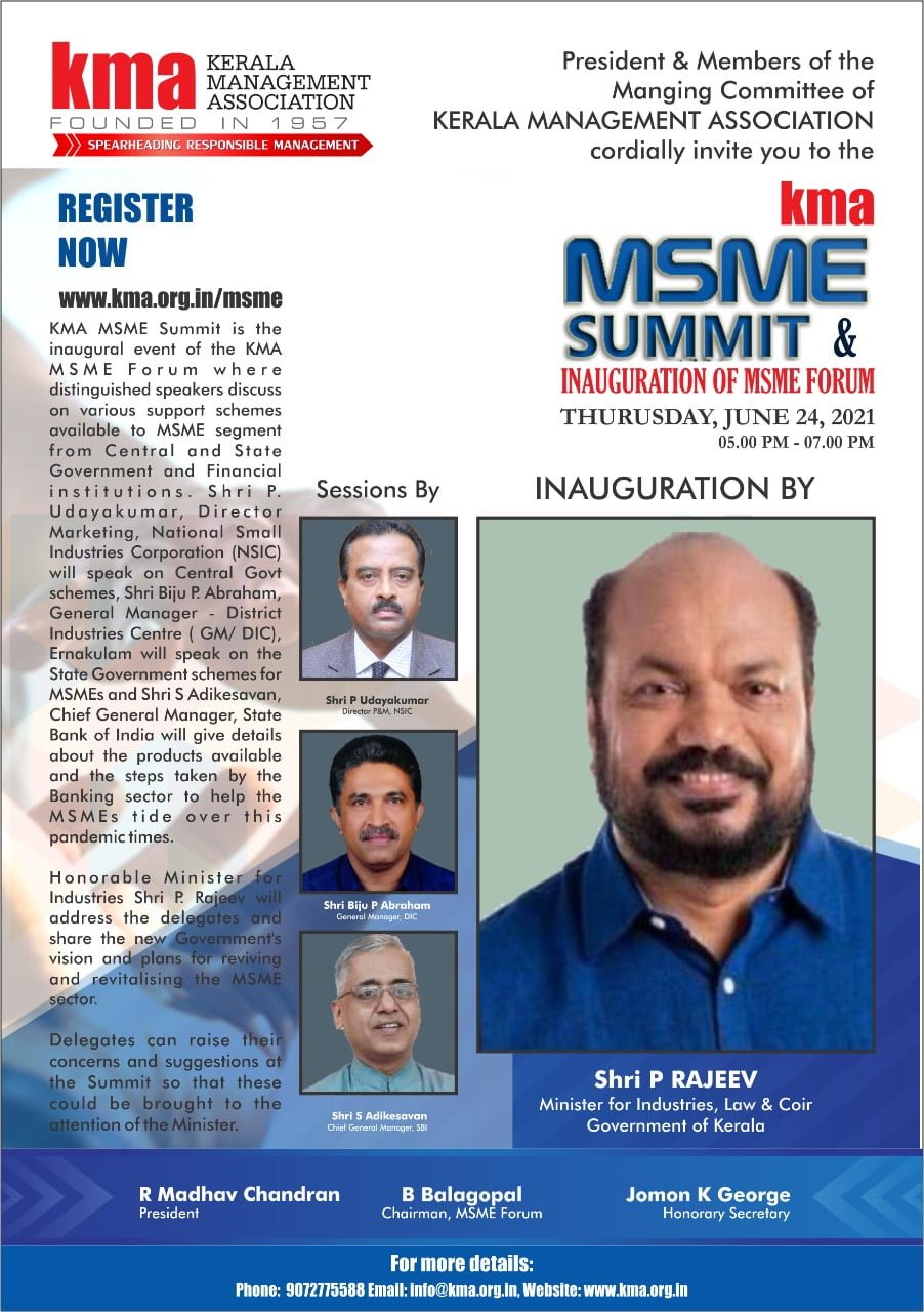 കേരളത്തിലെ പ്രമുഖ മാനേജ്മെന്റ് സംഘടനയായ കെ എം എ യുടെ നേതൃത്വത്തിൽ എം എസ് എം ഇ സമ്മിറ്റ് ജൂൺ മാസം 24 നു ഓൺലൈനായി സംഘടിപ്പിക്കുന്നു. സംസ്ഥാന വ്യവസായ – നിയമ വകുപ്പ് മന്ത്രി പി രാജീവ് സമ്മിറ്റ് ഉൽഘാടനം ചെയ്യും. സമയം വൈകിട്ട് 5 മുതൽ 7 വരെ
