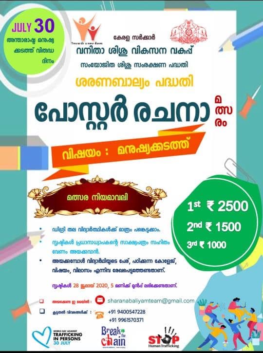 ബാലവേല,ബാലഭിക്ഷാടന, ബാലചൂഷണ,തെരുവ് ബാല്യ രഹിത കേരളം എന്ന ലക്ഷ്യത്തിനായി വനിതാ ശിശു വികസന വകുപ്പ് ആവിഷ്കരിച്ച “ശരണബാല്യം” പദ്ധതിയുടെ ഭാഗമായി ജൂലൈ 30 അന്താരാഷ്ട്ര മനുഷ്യക്കടത്ത് വിരുദ്ധ ദിനത്തോടനുബന്ധിച്ച് സ്കൂൾ-കോളേജ് വിദ്യാർത്ഥികൾക്കായി മത്സരങ്ങൾ സംഘടിപ്പിക്കുന്നു.