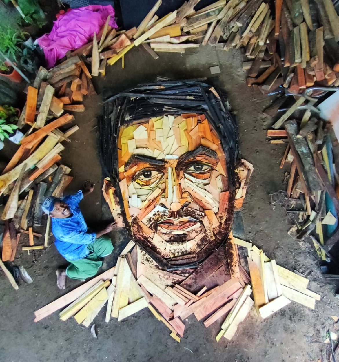ചിത്രകലയിൽ വ്യത്യസ്തതയുടെ പരീക്ഷണങ്ങൾ തുടരുകയാണ് പ്രമുഖ ആർട്ടിസ്റ് ഡാ വിഞ്ചി സുരേഷ്. ഏതാനും ദിവസങ്ങൾക്കു മുൻപ് 8500 ആണികൾ കൊണ്ട് നിർമ്മിച്ച ഫഹദ് ഫാസിൽ ഛയാ ചിത്രം വൈറൽ ആയതിനു തൊട്ടുപിന്നാലെയാണ് വിശ്രമമില്ലാതെ മറ്റൊരു കലാസൃഷ്ടി കൂടി അദ്ദേഹം വാർത്തെടുത്തിരിക്കുന്നത്. ഇത്തവണ ഒരുക്കിയിരിക്കുന്നത് പ്രിത്വിരാജിനെയാണ്, അതും വീടിന്റെ പിന്നാമ്പുറത്തു കൂട്ടിയിട്ടിരുന്ന വിറകു കൊള്ളികൾ കൊണ്ട്. അടുപ്പിൽ കത്തിക്കാനുള്ള വിറകു ശേഖരം മരമില്ലി ൽ നിന്നു വീട്ടിലെത്തിച്ചപ്പോഴാണ് മഞ്ഞ, ഇളം ചുവപ്പു നിറങ്ങളിലുള്ള കനം കുറഞ്ഞ വിറകു കക്ഷണങ്ങൾ ശ്രദ്ധയിൽ പെട്ടത്. ഉള്ളിലെ കലാകാരൻ ഉണരാൻ അധികം സമയം എടുത്തില്ല. കറുത്ത നിറം കിട്ടാൻ കൊതുമ്പുകളും പുക കൊള്ളിച്ച മടലുകളും കലാസൃഷ്ടിക്കായി ഉപയോഗപ്പെടുത്തി. പേപ്പറിൽ വരക്കും പോലെ അത്ര എളുപ്പമല്ല വിറകുകൾ കൊണ്ട് ചിത്രം നിർമ്മിക്കുന്നതെന്നും മുഖച്ഛായ രൂപപെടുത്തിയെടുക്കാൻ നല്ല പരിശ്രമം ആവശ്യമാണെന്നും അദ്ദേഹം പറയ്യുന്നു.