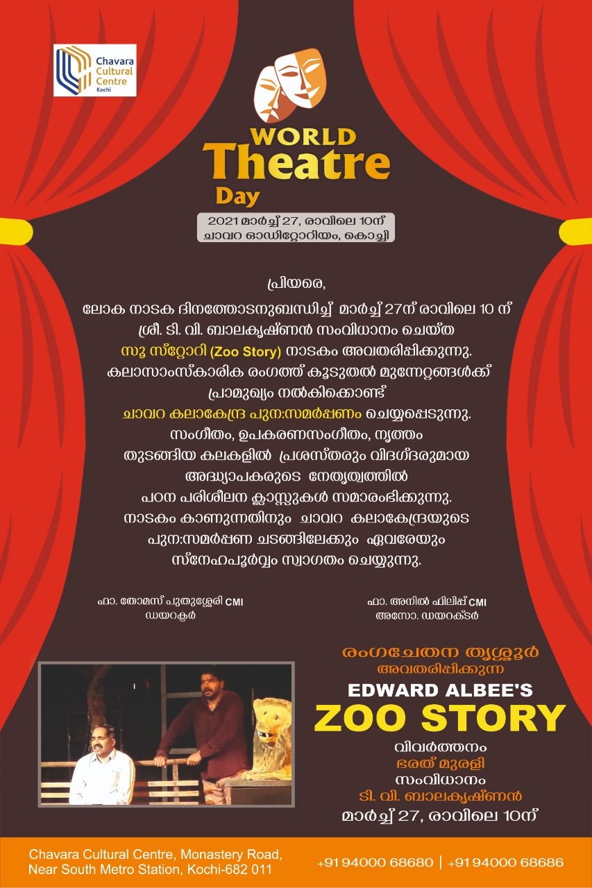 EventsGeneralKochi happeningsചവറയിൽ ലോക നാടക ദിനാചരണവും നാടകാവതരണവും by Kochi Localpedia March 24, 2021 written by Kochi Localpedia March 24, 2021 139ലോക നാടക ദിനമായ മാർച്ച് 27ന് എറണാകുളം ചവറ കൾച്ചറൽ സെന്ററിൽ നാടക ദിനാചരണവും നാടകാവതരണവും നടത്തുന്നു ശനിയാഴ്ച രാവിലെ 10 മണിക് ആരംഭിക്കുന്ന ചടങ്ങിൽ പ്രൊഫ എം കെ സാനു മുഖ്യാതിഥി ആയിരിക്കും. Kochi Localpedia 0 FacebookTwitterPinterestThreadsBlueskyEmail Kochi Localpedia previous post ടി ഡി റോഡ് റീ-ഡിസൈൻ മാത്രക ഏറ്റവും മികച്ചത്. next post “മാരൻ” നാടകാവതരണവും ലോകനാടകദിനാചരണവും 27 ന് പി.ഒ.സി ഓഡിറ്റോറിയത്തിൽ You may also like ജോൺ പോൾ കോർണർ പ്രവർത്തനമാരംഭിച്ചു November 22, 2022 സംസ്ഥാന സ്കൂൾ ശാസ്ത്രമേളക്ക് കൊച്ചിയിൽ തുടക്കമായി November 10, 2022 ലഹരിവിരുദ്ധ കൂട്ടയോട്ടം സംഘടിപ്പിക്കുന്നു November 3, 2022 നെടുമുടി അനുസ്മരണം 12 ന് October 11, 2022 സത്യജിത്ത് റേ ചലച്ചിത്രമേള ഇന്നുമുതൽ October 8, 2022 ദർബാർ ഹാളിൽ സത്യജിത്ത് റേ ജന്മശദാബ്ധി പ്രദർശനം September 28, 2022 വാട്ടർ മെട്രോ ഒക്ടോബറിൽ ആരംഭിക്കും September 14, 2022 ഓണം കൈത്തറി – വ്യവസായ പ്രദർശന മേളക്ക് തുടക്കമായി August 28, 2022 കൊച്ചി – മുസിരിസ് ബിനാലെ ഡിസംബർ 12 മുതൽ August 25, 2022 കൊച്ചിയിൽ 11 സ്ക്രീനുകളുമായി സിനിപോളിസ് August 18, 2022Leave a Comment Cancel ReplySave my name, email, and website in this browser for the next time I comment. Δ