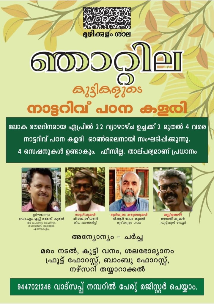 ലോക ഭൗമദിനമായ ഏപ്രിൽ 22 വ്യാഴാഴ്ച ഉച്ചക്ക് 2 മുതൽ 4 വരെ നാട്ടറിവ് പഠന കളരി ഓൺലൈനായി സംഘടിപ്പിക്കുന്നു. 4 സെഷനുകൾ ഉണ്ടാകും.ഫീസില്ല.